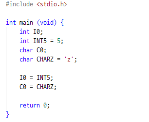 정수형과 문자형 변수를 각각 두 개씩 선언 후 대입하는 가장 기초적인 C 프로그램을 머신 언어로 변환한 결과이다.