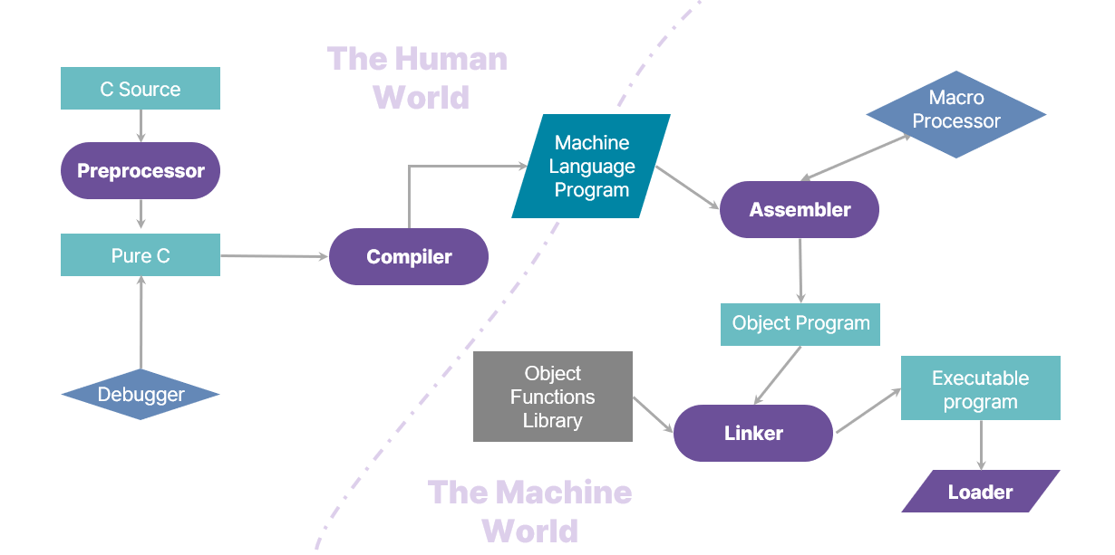 C언어, Python, Java 등 개발자가 주로 다루게 되는 언어는 모두 고급 언어(High-level Language)로, 전처리기와 컴파일러, 어셈블러 등의 시스템프로그램을 거쳐 컴퓨터가 이해하는 저급 언어(Low-level Language)인 머신 언어로 변환된다.