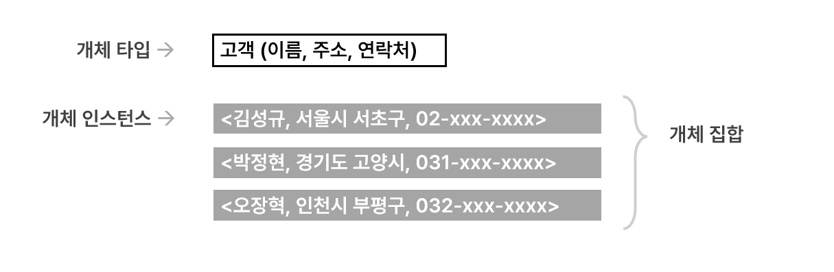 개체 집합 : 특정 개체 타입에 대한 개체 인스턴스들을 모아놓은 것을 말한다.
