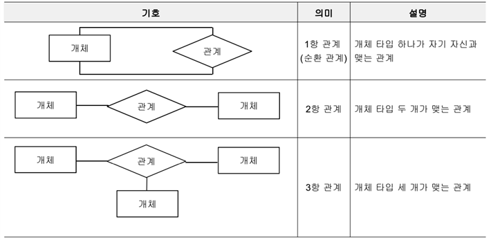 관계 차수란 관계에 참여하는 개체 타입의 수를 말하며, 차수에 따라 1항 관계, 2항 관계, 3항 관계로 나뉜다.