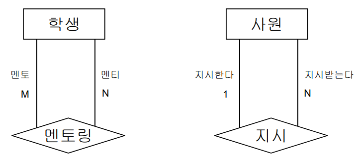 1항 관계는 개체 타입 하나가 자기 자신과 관계를 이룬다는 점에서 '순환 관계'라고 한다. 순환관계의 경우 특성상 그 역할을 알 수 없기 때문에, 반드시 역할을 표기해야 한다.