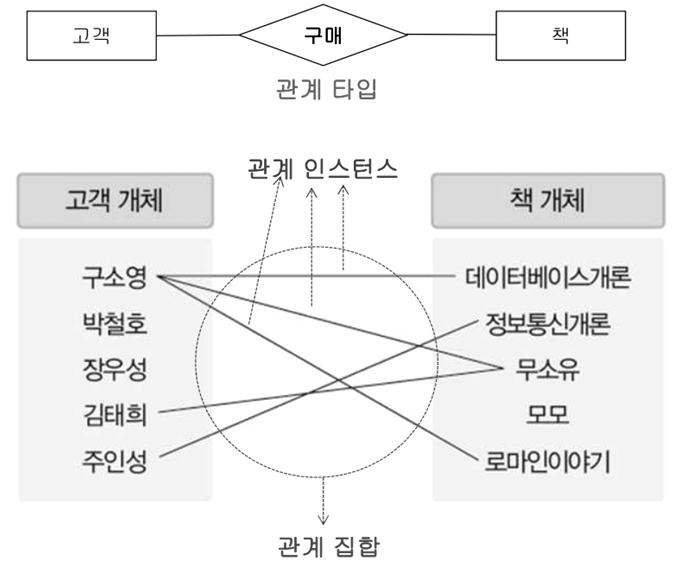 개체와 마찬가지로, 관계도 관계 타입, 관계 인스턴스, 관계 집합으로 구분할 수 있다.